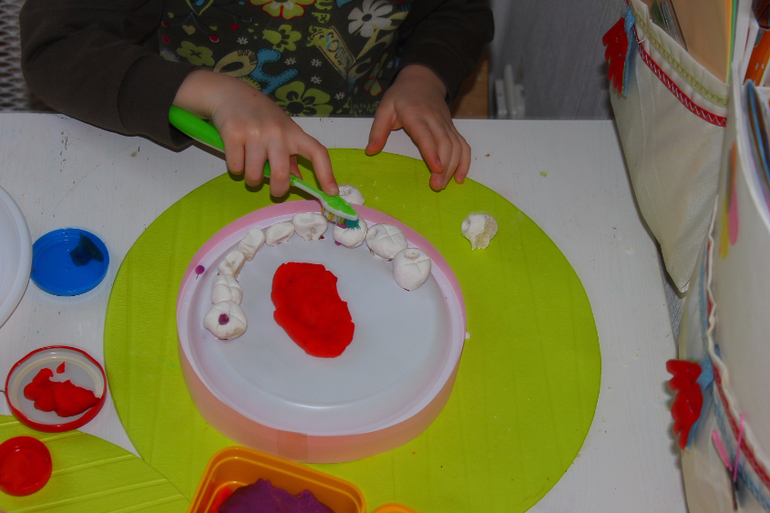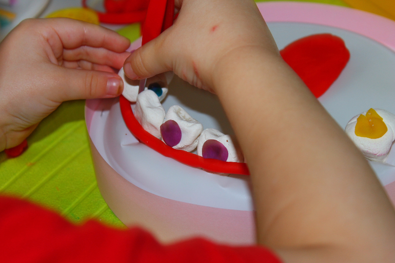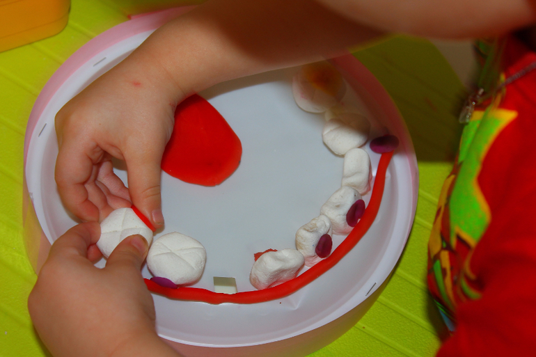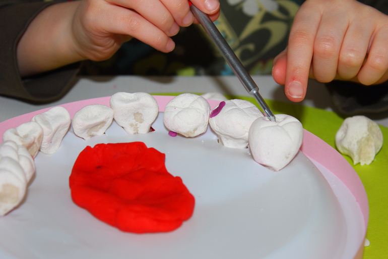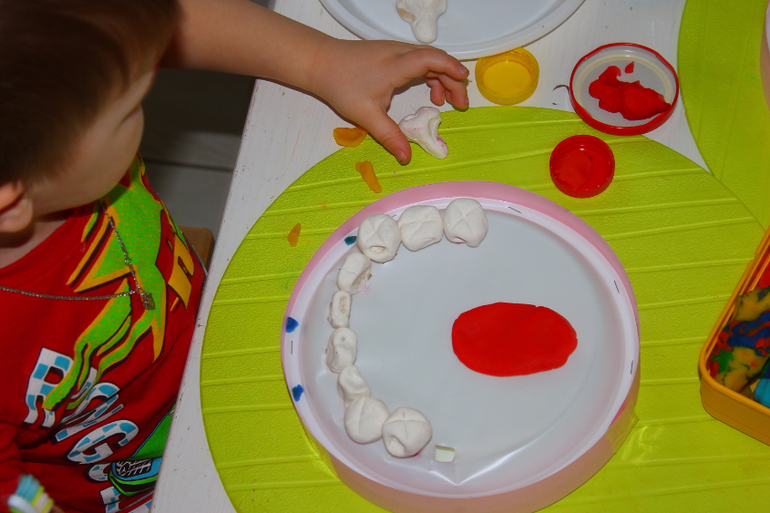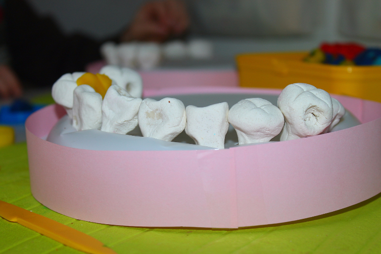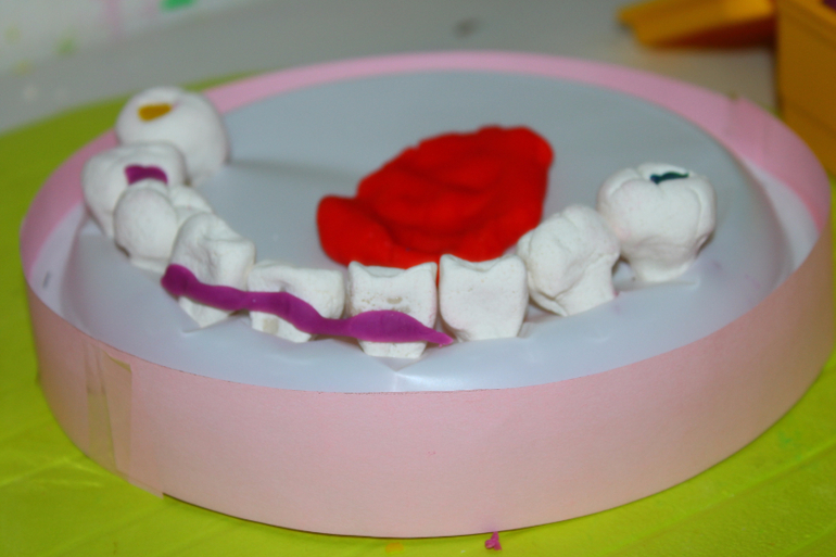 в тарелках заранее сделаны дырки, уже корня,чтобы зуб сидел плотно .Можно в принципе с другой стороны укрепить пластилином, но я хотела,чтобы зубы вынимались. Тарелки тонкие,поэтому я брала по 3-4 шт (и снизу 4 и сверху 4),чтобы челюсть была устойчивой и не продавливалась при лечении.
