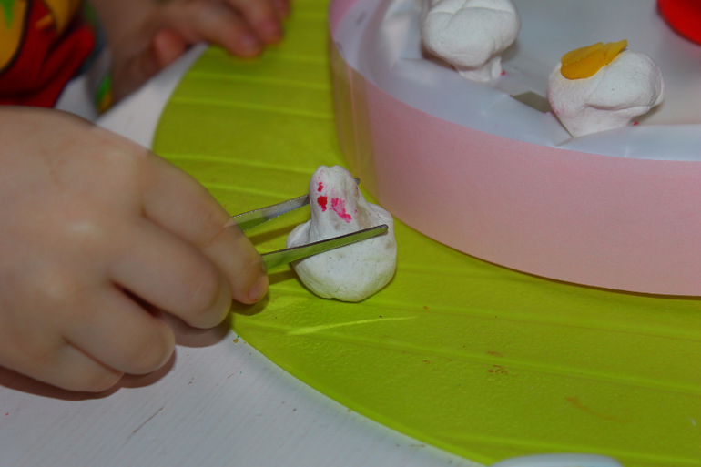 В качестве челюсти пластиковые одноразовые тарелки, соединённые по принципу летающей тарелки и скреплённые степлером и на специальную липучку прилеплены к столу, чтобы вовремя игры не двигалась во все стороны.