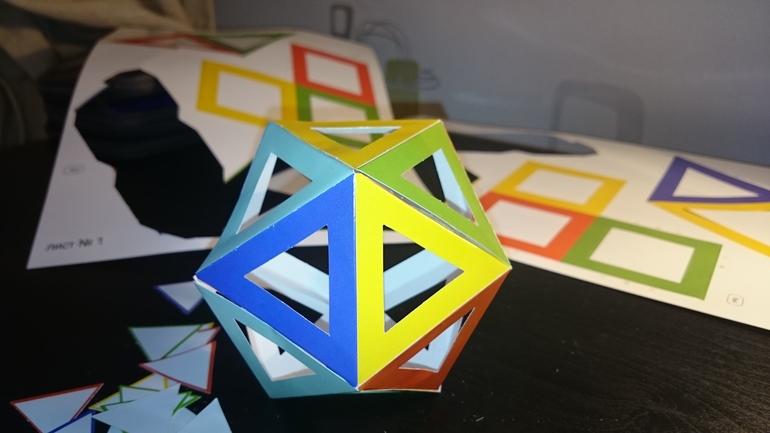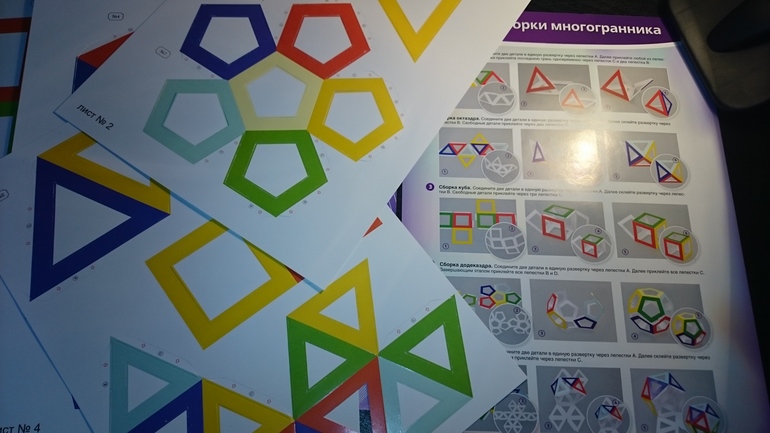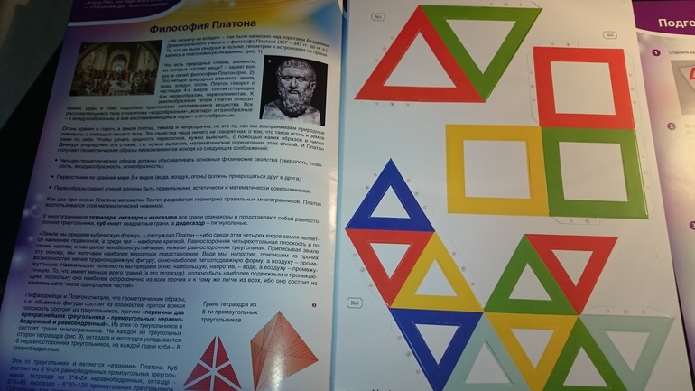 В номере историческая справка, описание многогранника, схема сборки с цветными фотографиями и набор для сборки пяти правильных многогранников, так называемых Платоновых тел: тетраэдра, октаэдра, гексаэдра, додекаэдра и икосаэдра".