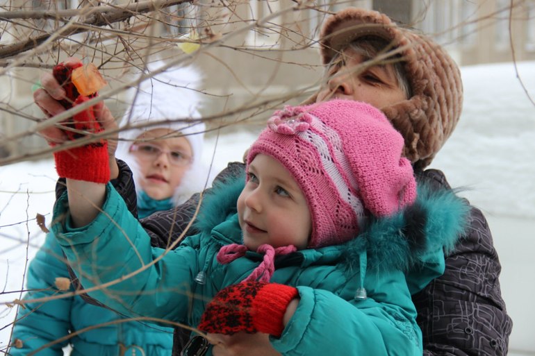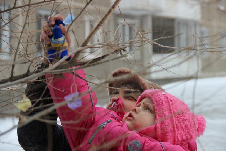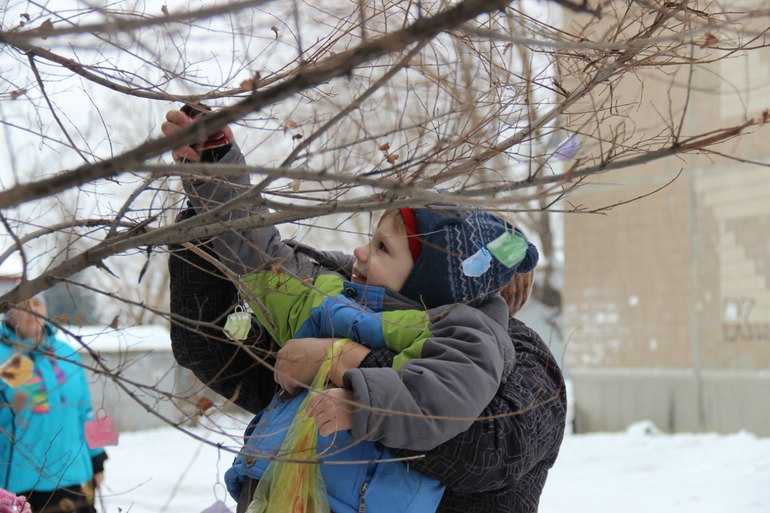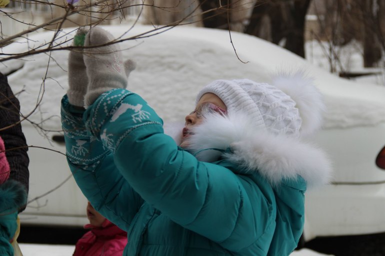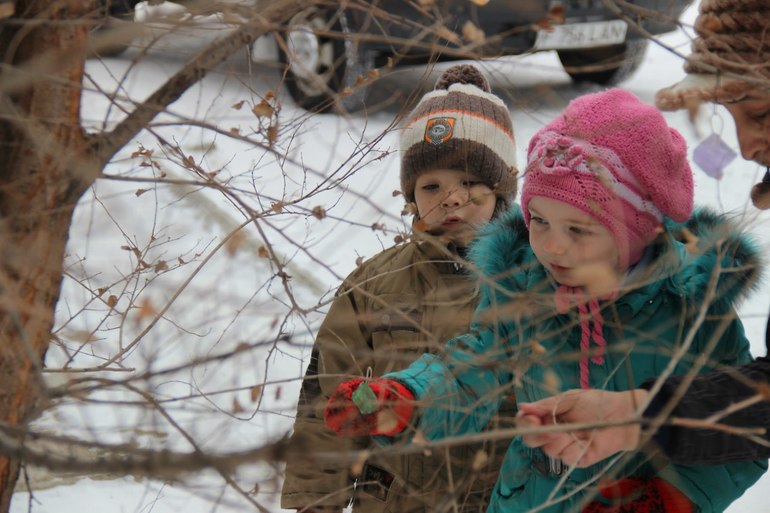Пока мы вешали ледышки - по очереди, Максим тряс дерево за ветку, отчего только что повисшие ледяшки послетели в рыхлый снег