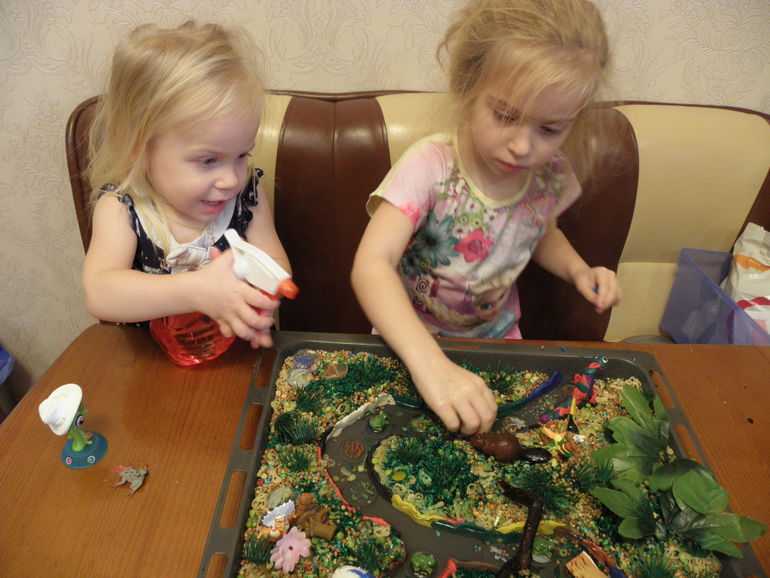 В сезон дождей Амазонка выходит из берегов - брызгаем водой из пульверизатора, заливаем берега водой с помощью губки.