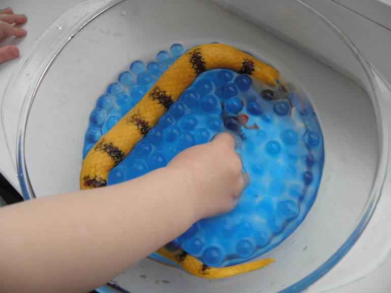 Еще один вариант игры - спасение лягушек от анаконды в миске с гидрогелем.