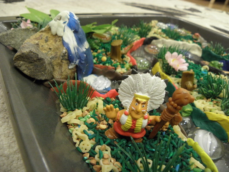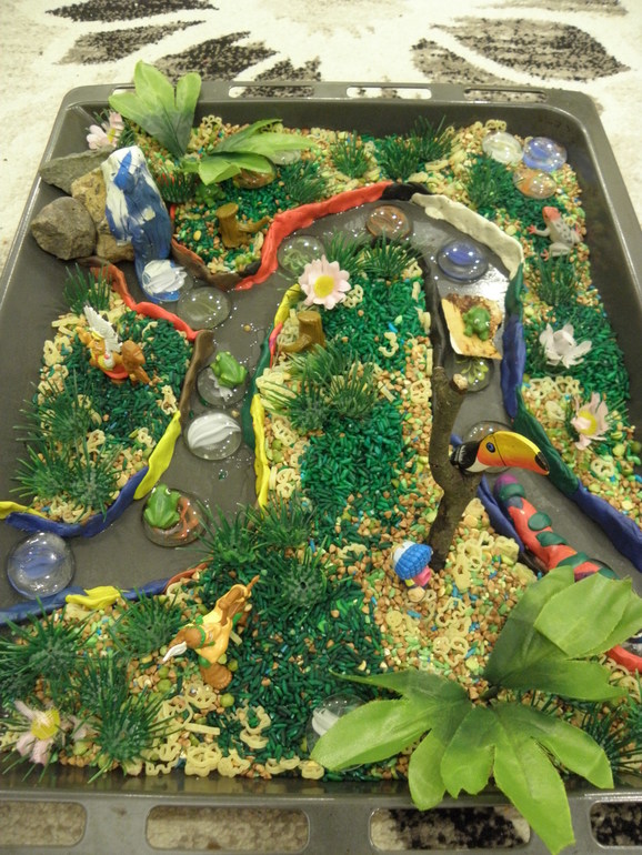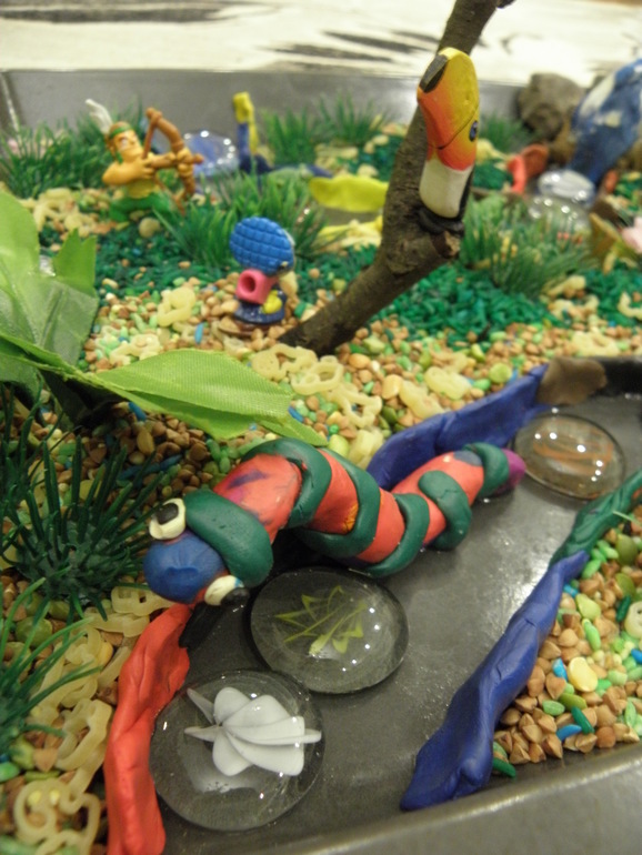 Делаем берега из пластилина, вокруг зеленые насаждения и крупа.Камни, водопад из пластилина. Много лягушек, анаконда. Иногда встречаются местные жители - индейцы.