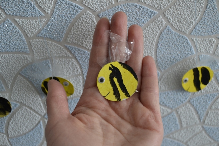 На маленькие кусочки пластилина и ниточки, привешали мы наших пчёл.