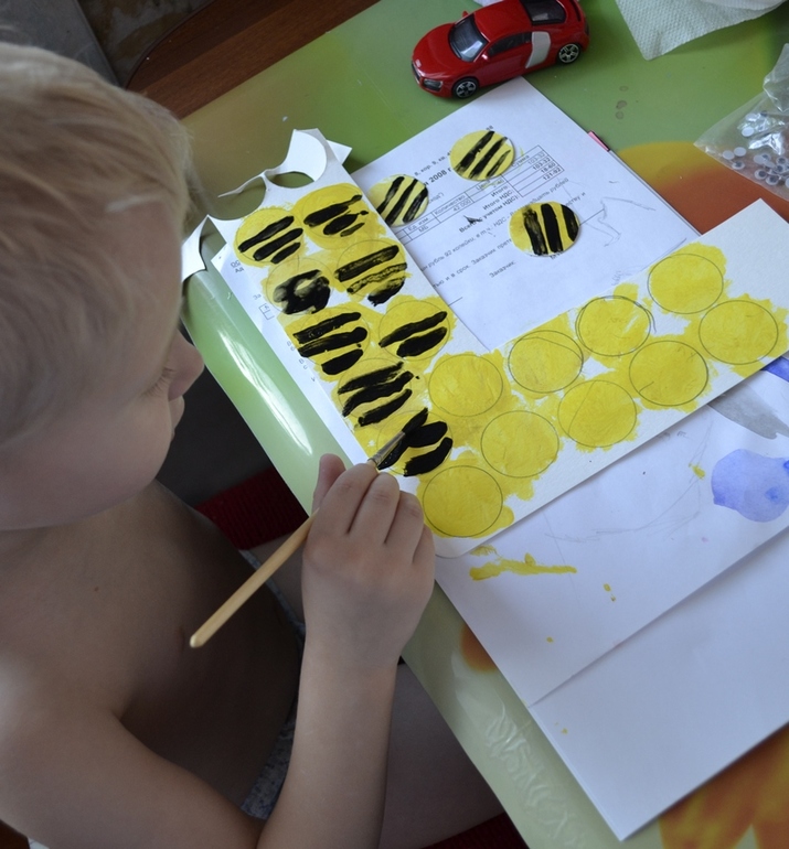 Залезла я в гугл искать пчёл, но когда Миша увидел что я хочу ему предложить (а это были пчелки-оригами) он сказал, что у него должны быть добрые и радостные пчёлы. Поэтому придумали своих! Делюсь :)