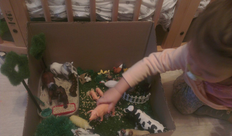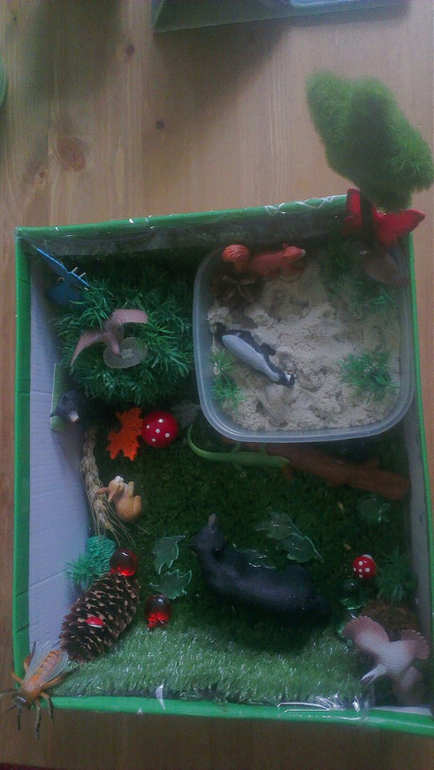 Фигурки у нас разные - Schleich, Mojo, Papo, Gulliver Collecta, российские в коробочке с надписью "Диалоги о животных". Для коробочек в ход идет все, что есть - старые коробки, пенопласт, крупы, песок, ракушки, мелочевка из фикс прайса, природные материалы, которые мы собирали осенью.