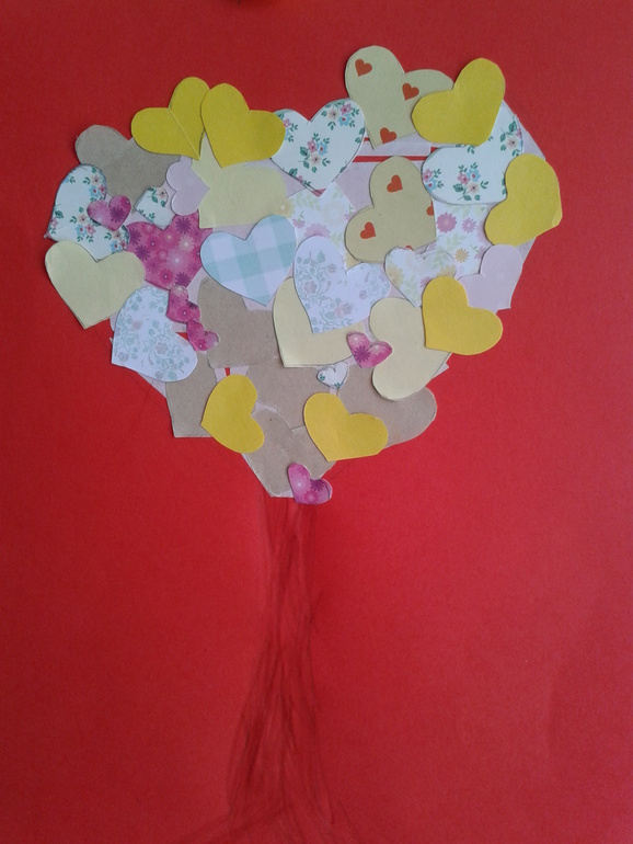 Совсем мало приготовлений: рисуем контур дерева на цветной бумаге, вырезаем сердечки из всего, что есть, и наклеиваем на двусторонний скотч (чудовещь!). А если есть наклейки-сердечки под рукой, то вообще красотаааа (и проще некуда), у нас вот не оказалось.