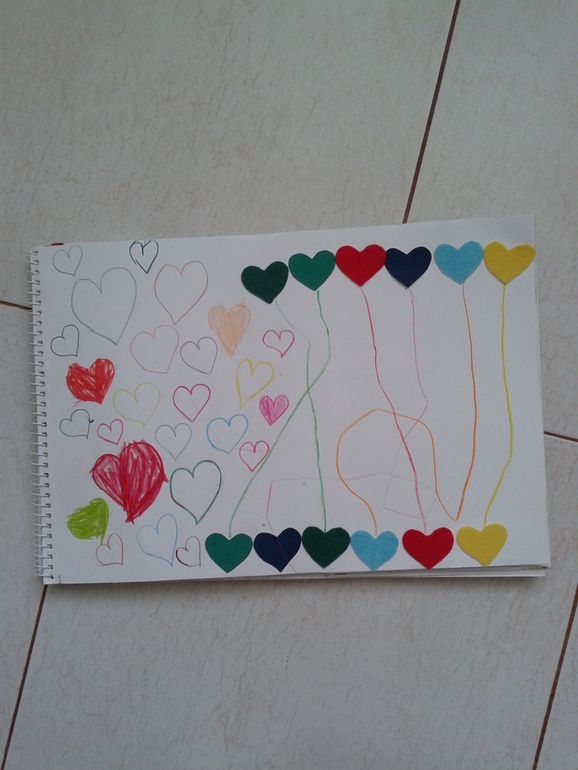 Опять же, если есть наклейки, то все становится намного проще. Я же вырезала сердечки из самоклеивающегося фетра и бархатной бумаги (продаются в отделах с разной бумагой для поделок, не дорогие). Соне очень нравится отклеивать основу от бумаги, и очень нравится наклеивать сами фигурки (опять же сенсорные приятные и разнообразные ощущения, фетр мягкий, ворсистый, бумага пожестче). Она сама все наклеивала и почему-то в рядок, хотя я объяснила, что наклеивать можно как хочет и дальше будут проводилки. Ну соответственно, дальше разными карандашами соединяла парные сердечки. Папа дорисовал сердечки, но раскрашивать их Соне быстро надоело.