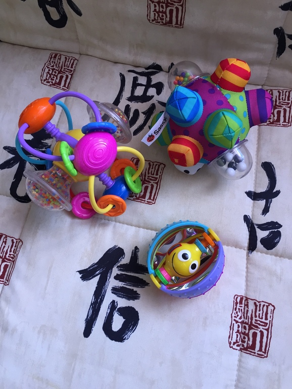 У нас есть похожий шар, как слева на фото. Сын с ним играл периодически с 6 месяцев до 1,5 лет. Грыз то, что там нанизано, перебирал и рассматривал. Вообще с некоторыми погремушками в год ещё как-то играл. Но интересней реальные предметы.