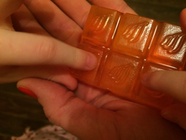 Оказалось сделать мыло - очень быстро и просто...у нас ушло в общей сложности, минут 5 на растапливание и заливку формы (мыльная основа очень быстро застывает после нагревания), красителя добавили весь тюбик..хотя написано 5 капель, по-моему...затем подождали часик и вынули из формы.