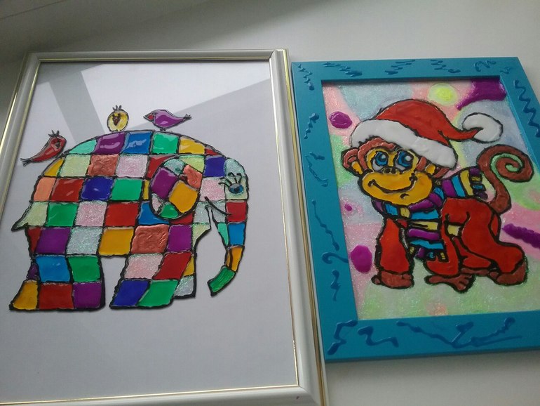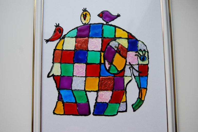 Мистер Умелец или Очумелые ручки (поделки, аппликации, интересные находки, идеи и задумки)Книжку про Элмера мы так и не прочитали, выросли из нее). Но рисуем его часто. Этой зимой дочке очень понравились витражные краски, просто,быстро и красиво! Дошла очередь Элмера))). Вот что получилось.