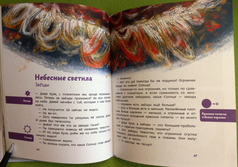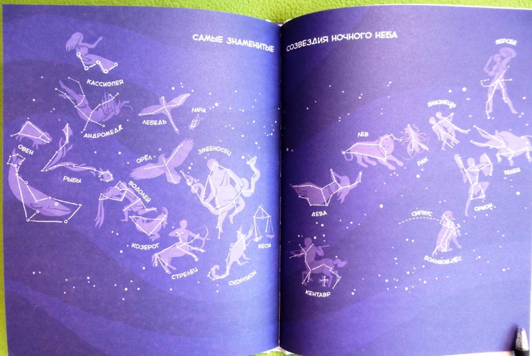 Есть отдельные развороты книги, где наглядно представлены самые известные созвездия и разворот где изображены планеты в сравнение по размерам со звездами.