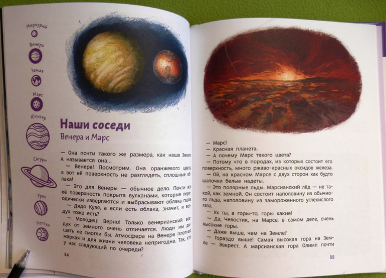 Интересный разворот книги, где на основе рисунка просто и понятно можно объяснить ребенку, что такое земной и меркурианский год, чем они отличаются