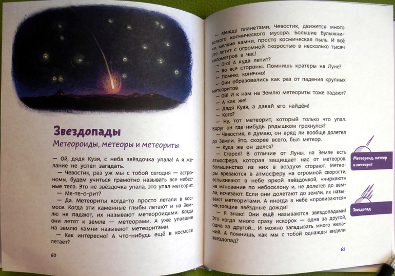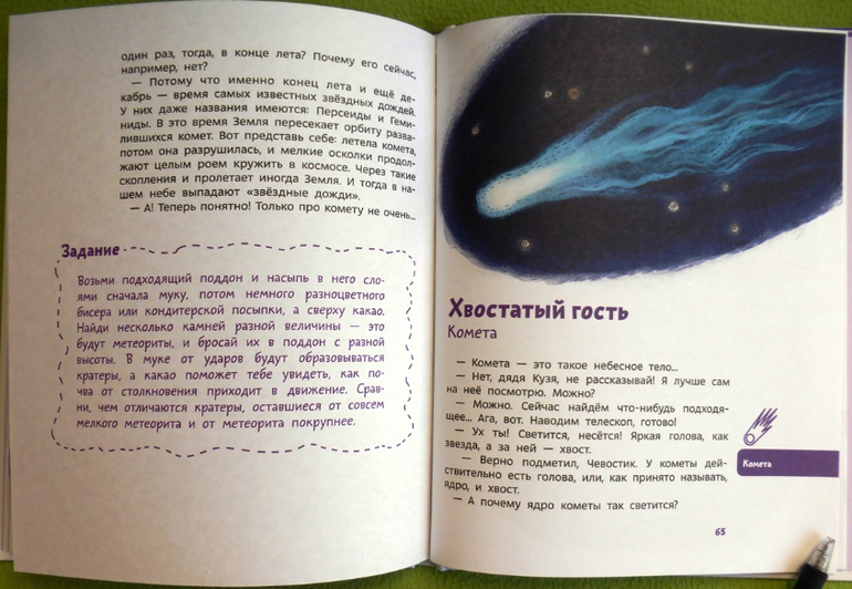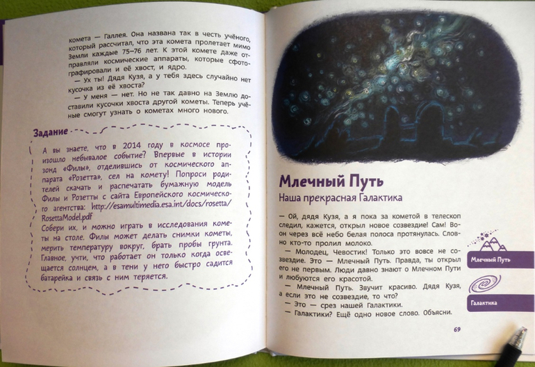 Отдельно хочется отметить наличие в книге увлекательных заданий для детей в конце каждой главы на закрепление пройденного материала. Это книга опытов и экспериментов. В ней много игровых заданий: создать Млечный путь и посмотреть на него со стороны, ориентироваться по звездам и сымитировать падение метеорита на Землю.