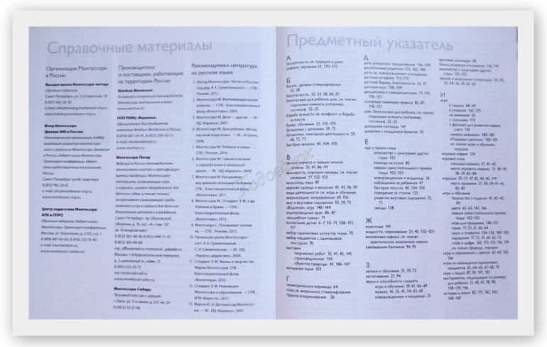 В конце книги есть справочный материал: организации Монтессори в России, производители и поставщики Монтессори материалов, рекомендуемая литература.