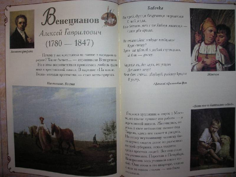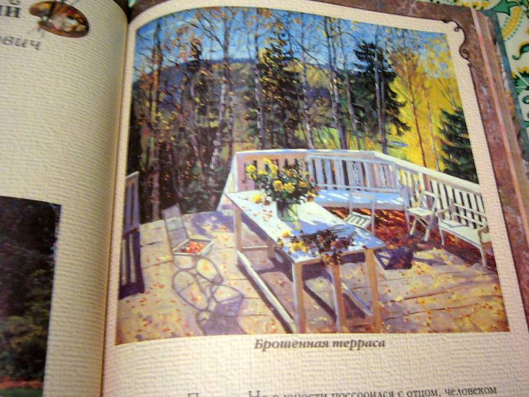 Каждому художнику отведен отдельный разворот книги. Текст и репродукции картин обрамлены в рамочку,