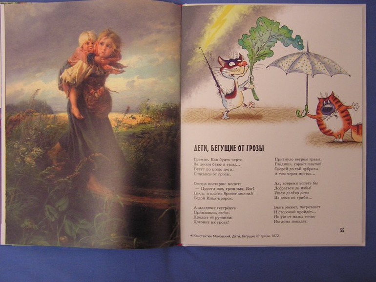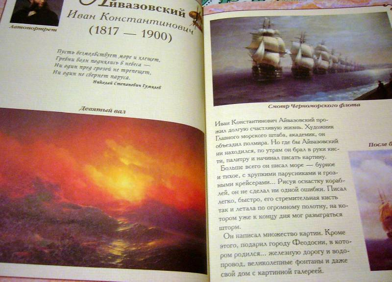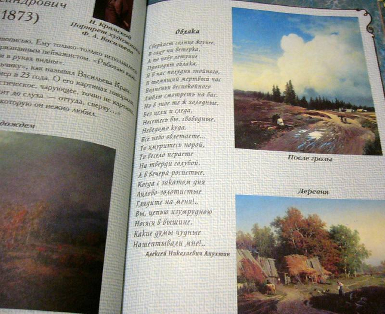 Репродукции сопровождают интересные факты из биографии художника и стихотворения известных русских поэтов и писателей Тютчева, Гумилева, Толстого, Блока.
