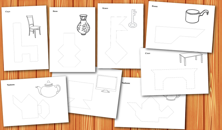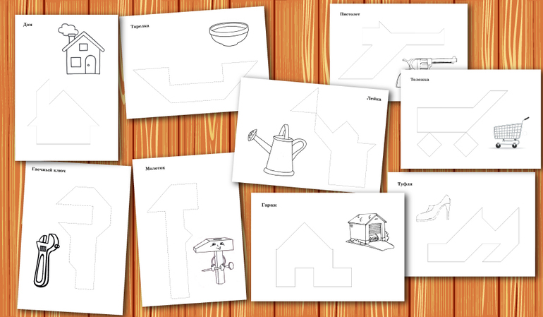 Контурные схемы к Танграм для наложения без прорисованных внутренних границ. Это достаточно сложный уровень освоения головоломки, так как требуется умение зрительного членения формы на составные части - геометрические фигуры.