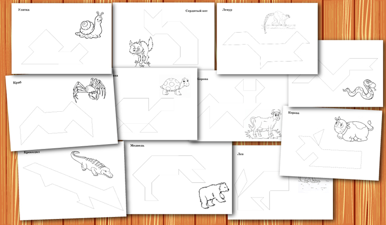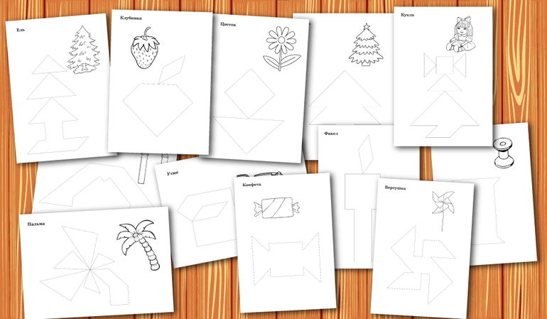Рисунок рядом с каждой схемой подобран так, что он макисмально отражает силуэт этой схемы, что помогает ребенку "увидеть" то, что он собрал из танграма.