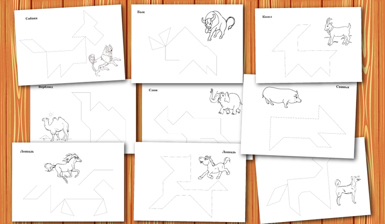 В комплекте 106 контурных схем для наложения на разные темы. Схемы сделаны под Танграм размером 10см*10см.