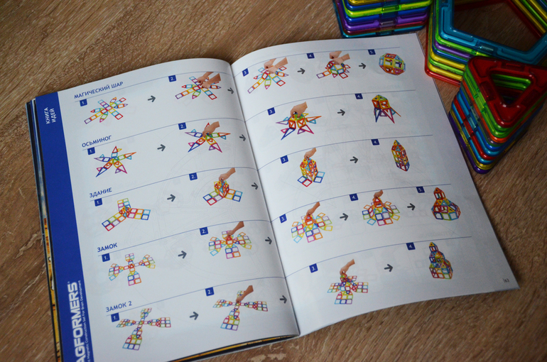 С каждым заказом также присылают Книгу идей, но это скорее обычная рекламная брошюра, а идей там всего пара страничек. Гораздо больше информации о сборке разных фигур можно найти на том же ютубе)