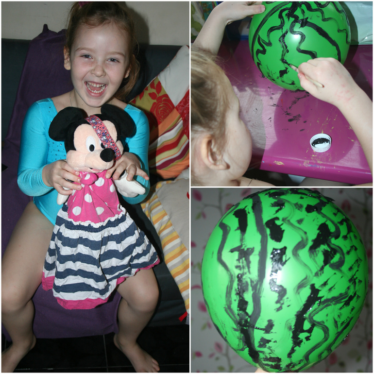 Наш корабль из груши благополучно отплыл от берега, но очень скоро путь нам преградили пираты, которые требовали угощений. Камилка превратила мягкую игрушку в коварного вымогателя, а потом угостила - шариком-арбузом. Рисовать на воздушном шарике Камику очень понравилось, необычное и затягивающее занятие!4. Встреча с драконом.
