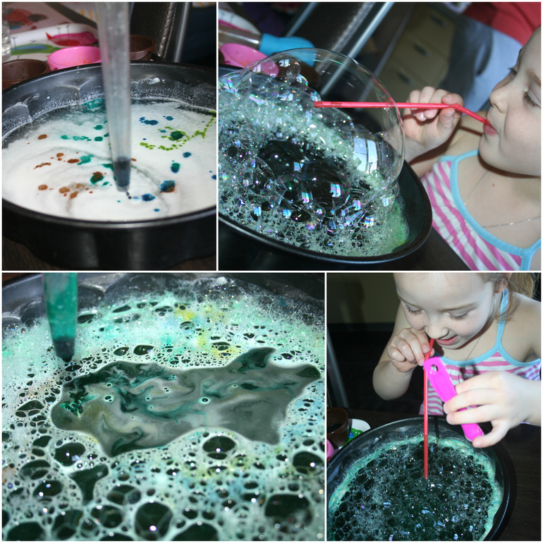 Оставив дракона качаться на волнах, мы продолжили свое путешествие и оказались в черных водах чернильного моря. Точнее сначала воды были белыми (вода+мука), а мы их сделали черными, хорошенько раскрасив пищевыми красителями при помощи пипетки. Рисовать по мучной воде очень любопытно, цветные капельки зависают между дном и поверхности как бы посередине, превращаясь в красочные мешочки.Наигравшись с красками, мы добавили к воде средства для мытья посуды (фейри), и наше чернильное море забурлило с новой силой. Камилла просто пищала от восторга! Ей безумно понравилось надувать большие пузыри, а внутри их маленькие, вытаскивать и снова вставлять трубочку в пузырь и раздувать его все больше, а так же выдувать пузыри прямо из трубочки в воду. Этот опыт так понравился Камилке, что теперь мисочка с подобным составом всегда стоит у меня наготове, потому что дуть большие пузыри Камилка хочет почти каждый день :-)))