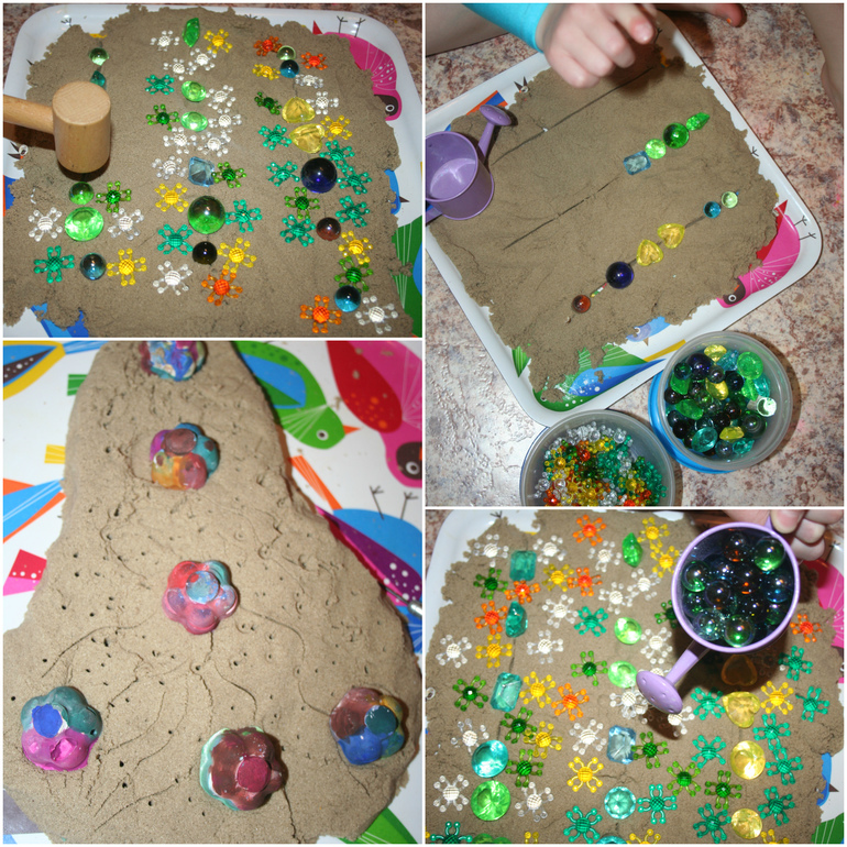 Добыв семена из бутылки, мы тут же пустили их в дело. Разбили грядку из кинетического песка и приступили к посадке, прополке, удобрению и поливке. В качестве воды - сверкающие шарики, а удобрение - цветочный конструктор. Наигравшись в огород слепили из песка большую грушу, разрисовали ее узорами с помощью стеков и украсили цветочками. Теперь можно отправляться в плавание!3. Встреча с пиратами и арбуз!