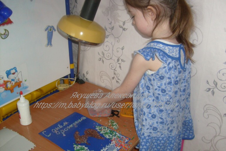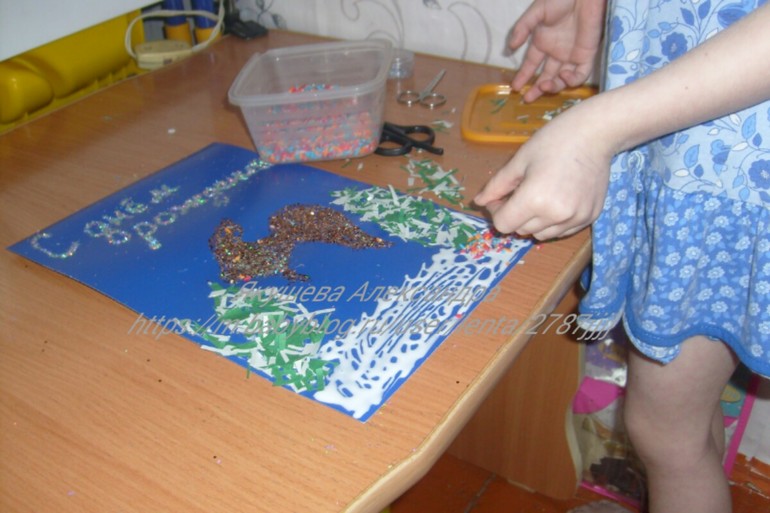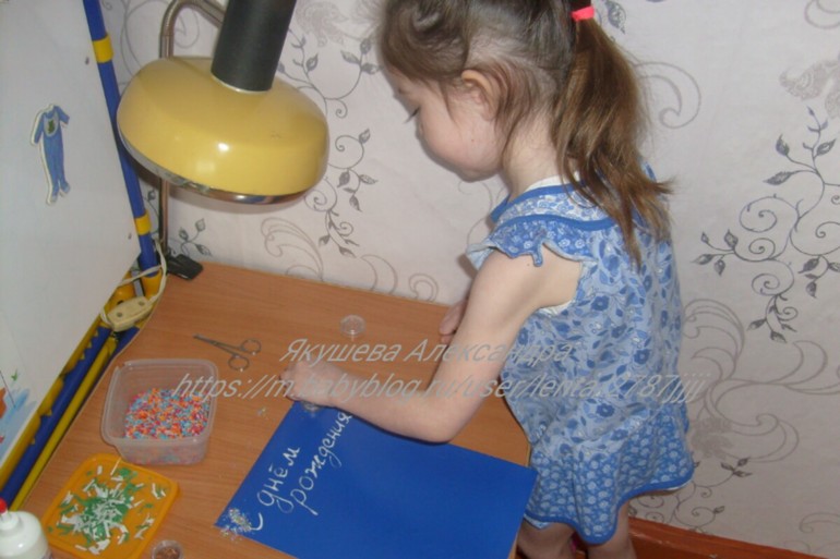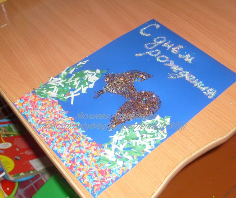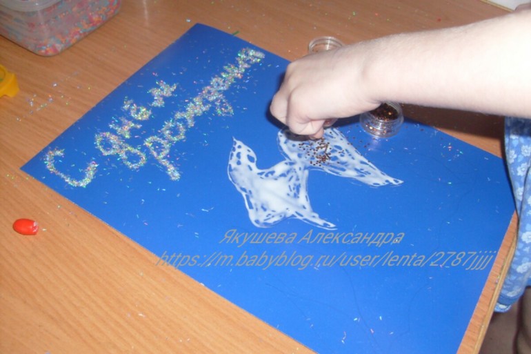 Итак' написали поздравительную надпись клеем ПВА' посыпали блеском' лишнее стряхнули