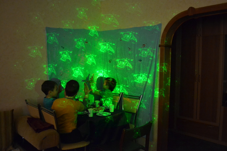Тему как уже понятно взяла космос.На стену повесила ткань,наклеила ракеты,тарелки,звездочки.Когда включили подсветку детям очень понравилось,руки пошли в ход -теневые игры.На стол детям тоже постаралась приготовить космическую еду,хотела даже все по пакетикам разложить,но не стала)В конце трапезы рассказала,что инопланетяне спрятали свечи от торта и надо найти,с радостью все согласились.1 задание пройти по огненной планете по волшебной линией и найти подсказку в колбе(киндер сюрприз).