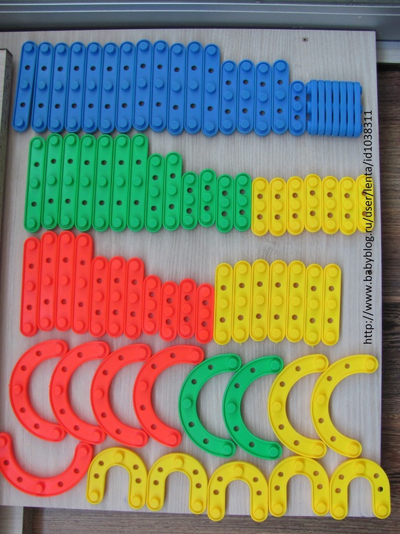 Дальше эволюционное древо начинает ветвиться. Детали становятся объемными, разрезы превращаются в зубчики. Такие конструкторы еще называют решетчатыми. Но в данном случае он буквально зубчатый (заметьте, на фото оригинальный дизайн, оставленный зубами моего младшего). Данный конструктор хорош еще тем, что поролоновыми деталями можно играть в ванной, наклеивая их на стену. Ну и учиться считать: количество дырок на деталях - от одной до шести.