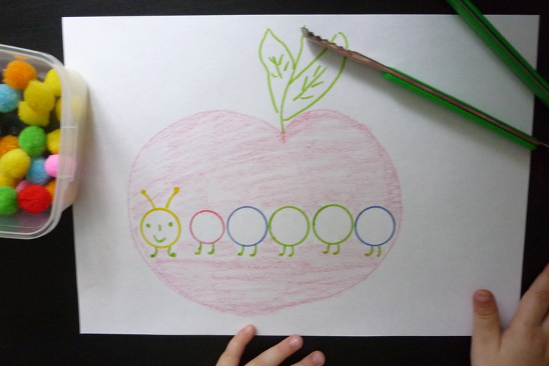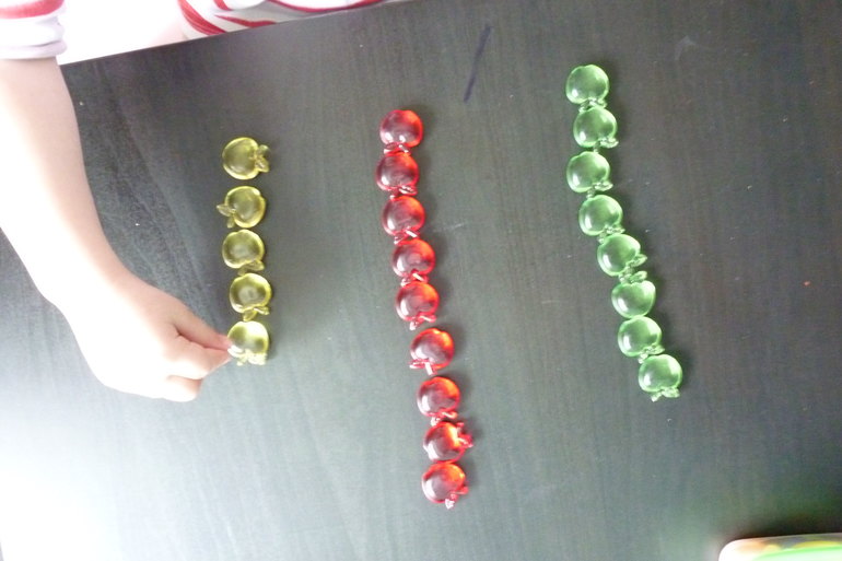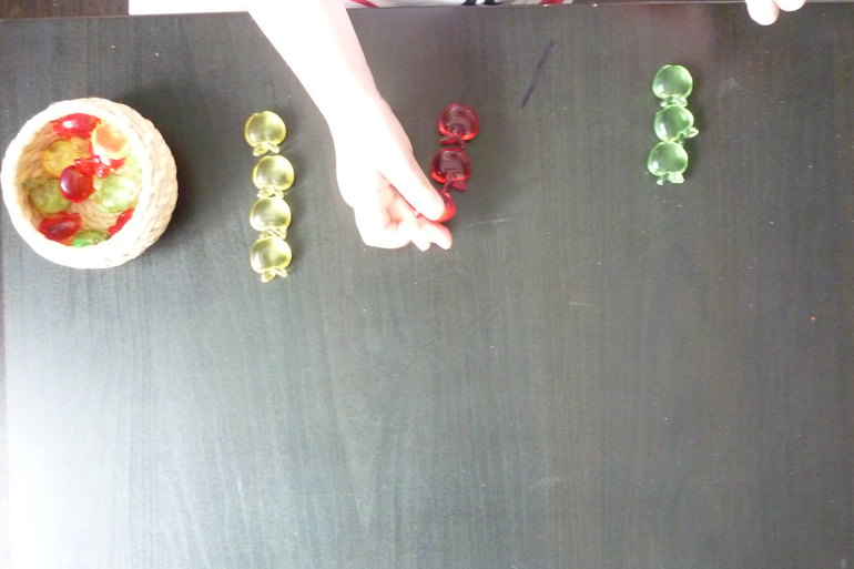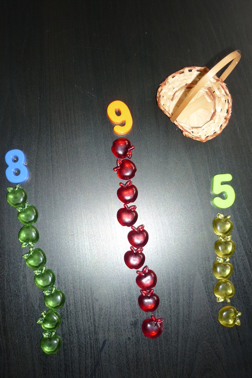 В лукошке яблоки 3 цветов. Сашуле надо было разложить яблоки по цветам. а затем мы вместе посчитать и подобрали циферку . Сашуля очень любит подобные задания, мы их часто проводим