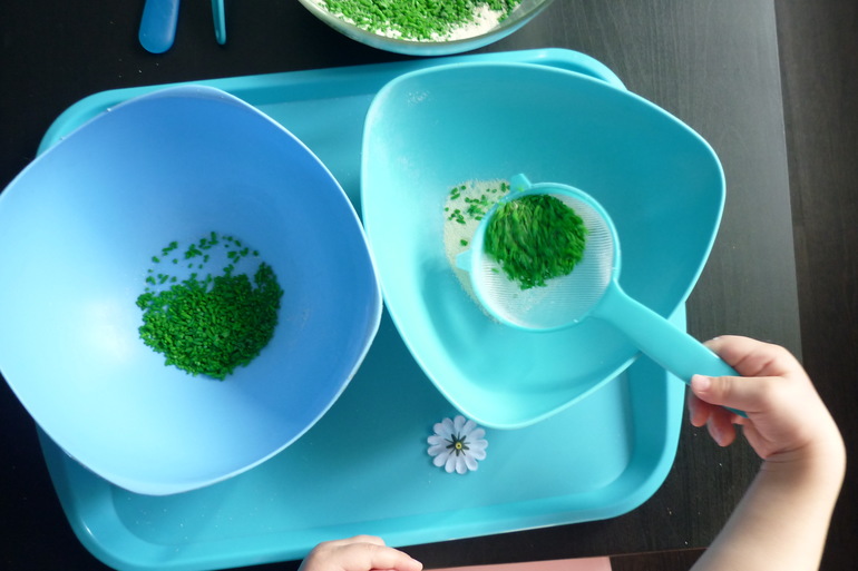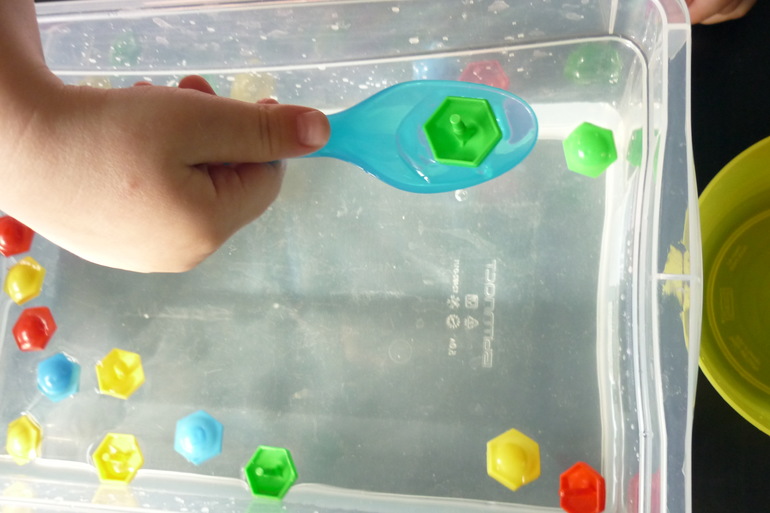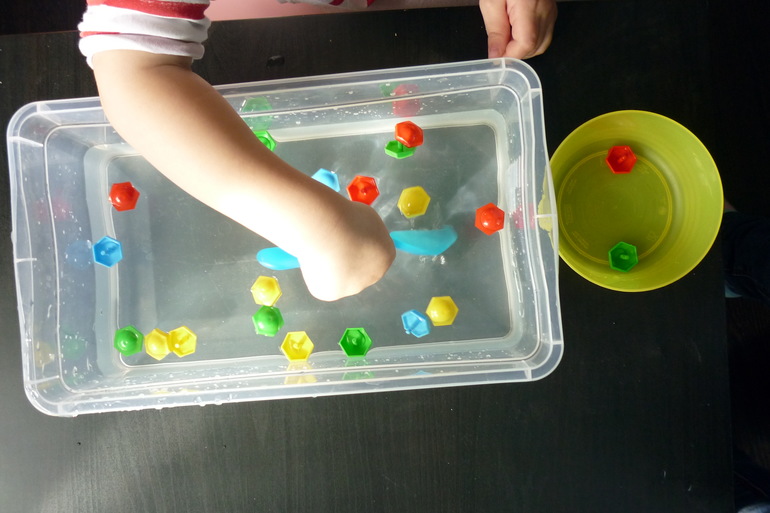 Предложила малышке поиграть с водой, конечно ответ получила положительный.Насыпав мозаику.говорю "Какие красивые цветочки у нас плавают". Сашуля: " нее, " и показывает пальчиками, как ходит крабик.