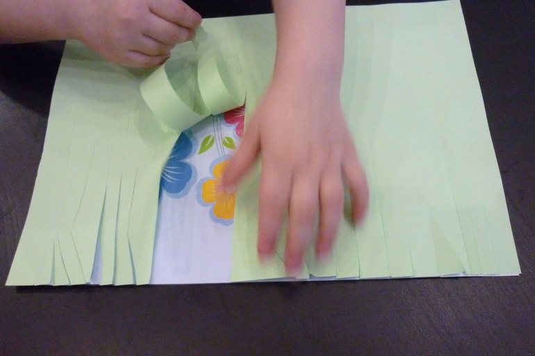 Сашуля нарезала травку. потом приклеили к картинке... и искали . что же спряталось за травкой ??