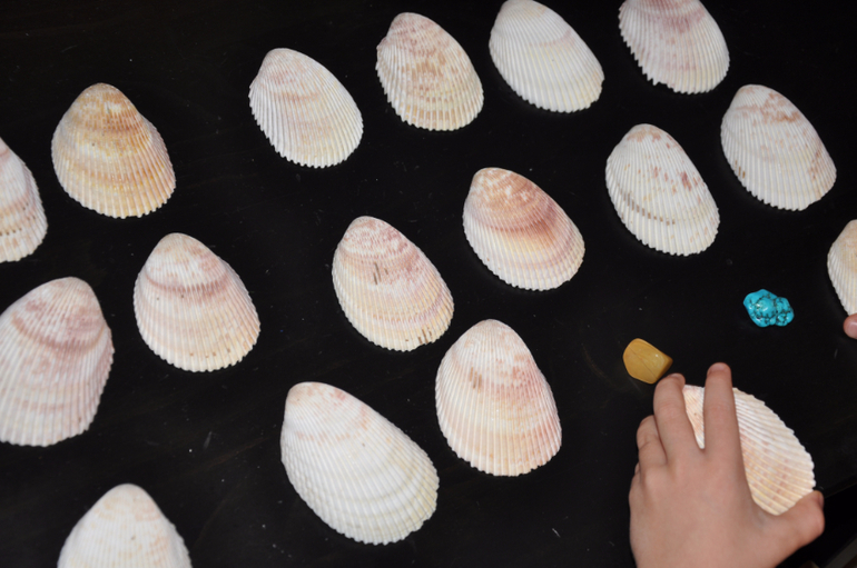 Честно скажу, играть именно в этот вариант игра в мемо-пары доставляет нам особое удовольствие - ведь самоцветы такие гладкие и яркие, а ракушки напоминают об морском побережье