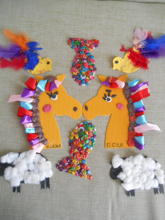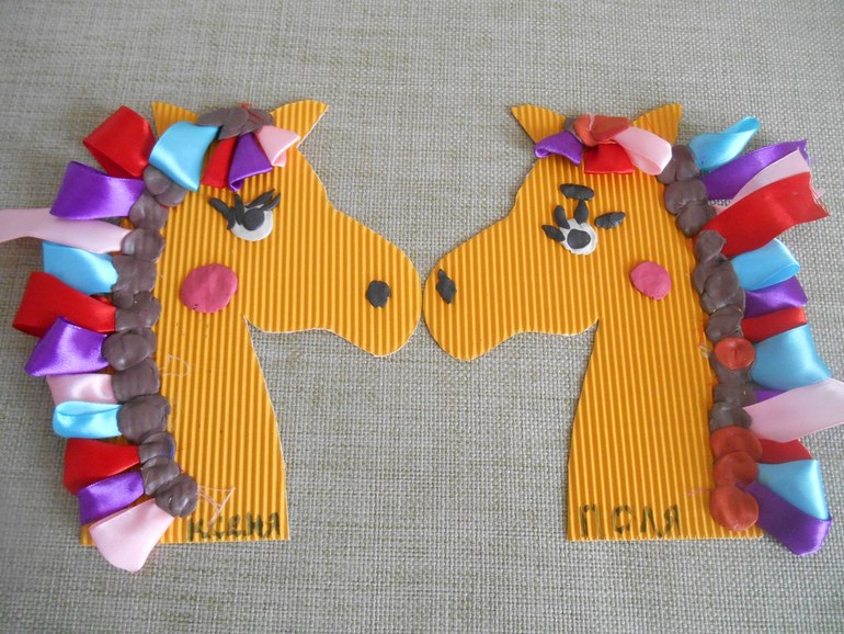 Последняя это наши коняшки. Вам потребуется картон у нас гофрированный, пластилин, обрезки ленточек и все. Здесь видно что грива в виде петелек и некоторые вылезли, в итоге мы с девочками пришли к выводу, что лучше выпустить ленточки, больше похоже на гриву и длиннее. Глаза дети делали сами, как и щечки с носом. Ленточки в самом начале я помогала скручивала и держала, а они по очереди приминали пластилином.