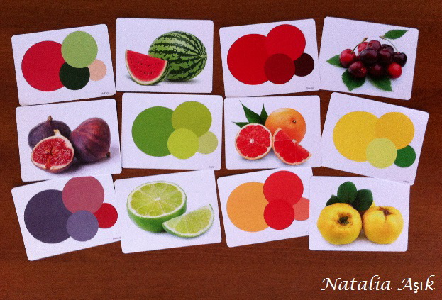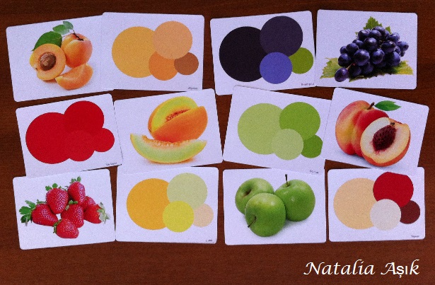 Малышам можно выдать 2-3 наиболее контрастных изображения, а деткам постарше можно уже предлагать весь набор, в зависимости от того, как игра пойдет :) И конечно же, надо обязательно проговаривать, как мы ищем оттенок к изображению, какие доминирующие цвета на каждом изображении, какие вообще бывают цвета и оттенки.