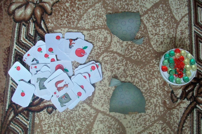 Распечатала карточки, мешки, приготовила яблочки из магазина "Фикс-прайс". Вытаскиваем карточку и наполняем мешок или опустошаем его, угощая попадающихся зверей. У кого наберется полный мешок, тот и выиграл. Также игра на счет, "плюс" и "минус".