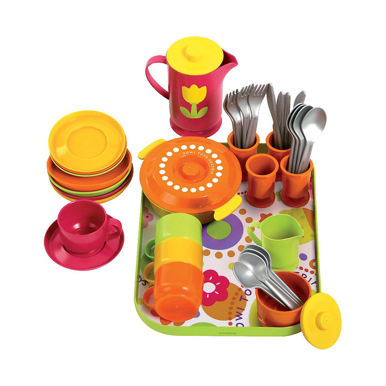 Задел на будущее к 1,5-2 годам. Но сын уже играет, поэтому игра на двоих. Сонечка тоже подражает маме, приборами по чашке, тарелке стучит.