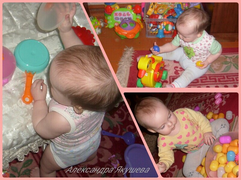 Почему кора и ветки перебор? Если аккуратно подготовить, то ими не поранишься, и проглотить не получится. А вот ощупывать ребёнку очень нравится. У нас как раз такая сенсорная коробка была с 6 до 9 месяцев, да и сейчас иногда достаем. И рисовать в 6 месяцев можно: мы рисовали акварелью, водой и пальцами. Я кисточкой мазала ладошку и пальчики, а ребенок оставляла отпечатки, потом уже сама пальцами в краску тыкала. Акварель не такая яркая, как пальчиковые краски, но зато легче отмывается, и ее не расплескаешь по всей квартире. И она бывает съедобная, на случай поедания. И тесто можно самой сделать для лепки: вода, соль, мука. Даже и съест кусочек - ничего не случится. На одной из фотографий у вас видна игрушка для новорожденных - растяжка с шариками для кроватки. Вот эти шарики снять или те же яйца от киндеров и предложить бутылку с подходящим по диаметру горлом. Моей очень понравилось проталкивать эти шарики в горлышко от молочной бутылки. Как раз в этом возрасте. А еще из развивающих занятий есть школа семи гномов, с 0 до 1 года. Было бы желание, а занятие можно для любого возраста придумать.