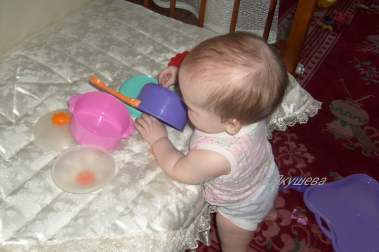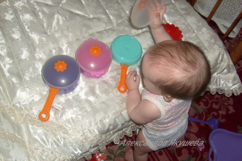 Подозревая о провале этой операции заранее' я не стала искать кучу разных по диаметру баночек' ограничилась детским набором посуды. Справедливости ради надо сказать' что одну крышку она положила на кастрюлю:-)