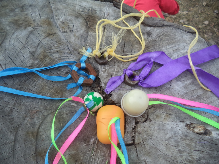 Капсулы от киндера и бахил(внутрь для тяжести насыпали камешки), старые гайки, мячик попрыгун (ленточки прицепили с помощью гвоздика со шляпкой)- игра готова!
