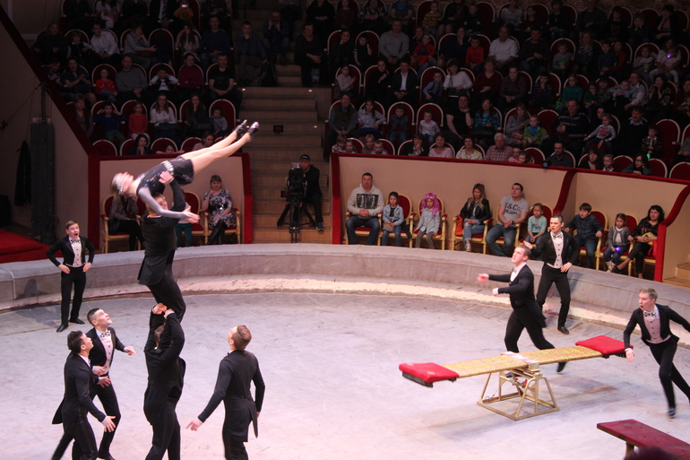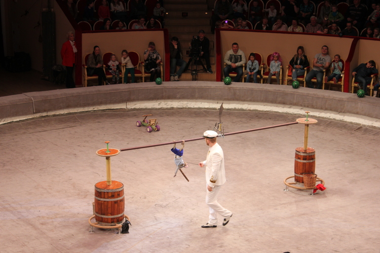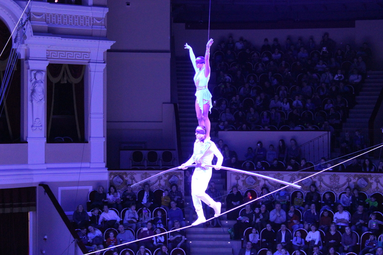 Номер длинный и очень интересный. Что только они не делали и ходили по канату с закрытыми глазами и один нес на плечах по одному и по два человека. А еще один трюк. Канат был поднят на большую высоту с одной стороны и под музыку артист поднимался вверх. Удалось с третьей попытки, но конечно так было задумано. Зато как за него болели детишки, как кричали:"Давай, давай!" Как поддерживали. Один раз он даже сделал вид, что чуть не сорвался... Весь зал ахнул. Но конечно так все было задумано.