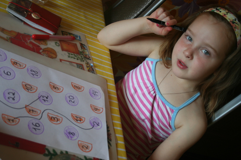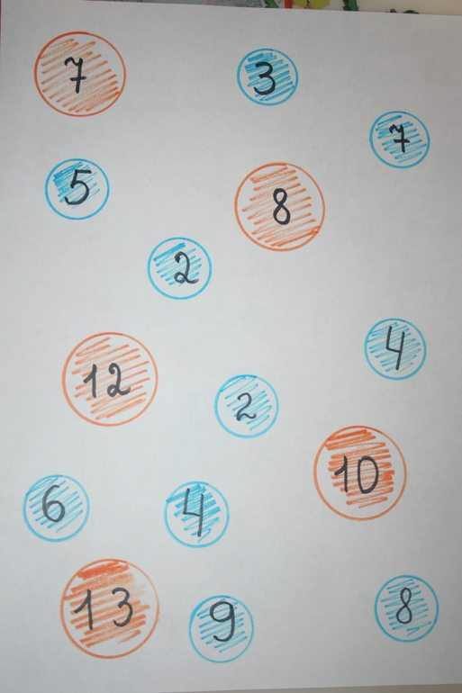 На листе рисуем полные кружки и их половинки, проставляем соответствующие цифры (10-5, 4-2, 6-3 и т.д.). Ребенок должен соединить их попарно. Если уровень математики у малыша еще недостаточно хорош, то можно рисовать одно целое ядро и две одинаковые половинки, так ребенок наглядно сможет увидеть, что два одинаковых числа могут давать одно новое.