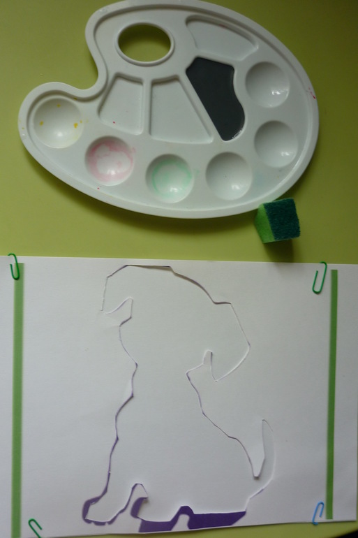 А собачка ждет Сашулю уже за столом с красками и губкой.