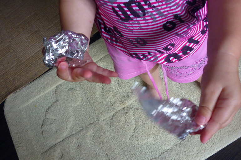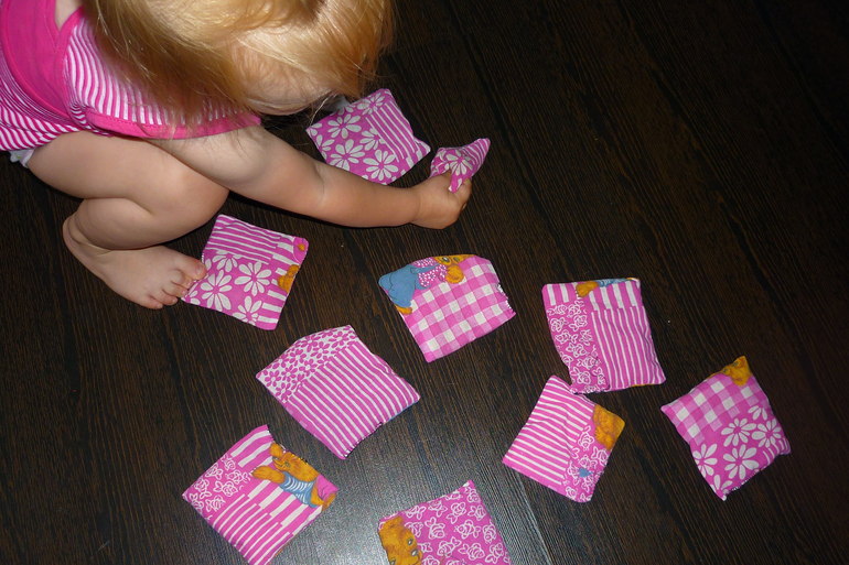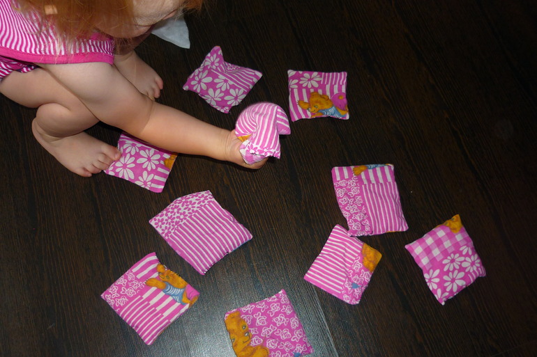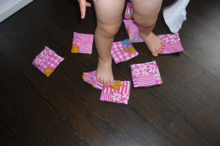 2. Мешочки с крупами. Всегда мы их щупаем ручками, конечно не обходиться и без пробы на зуб, но в этот раз предложила походить ножками по ним.