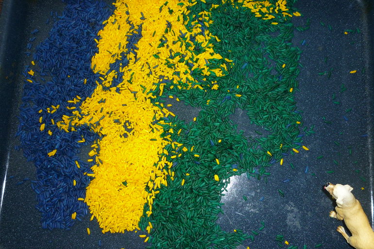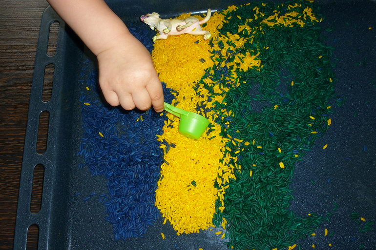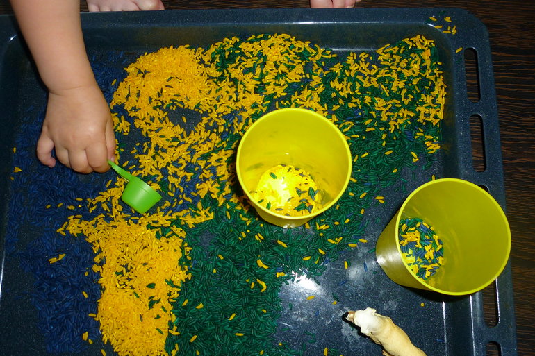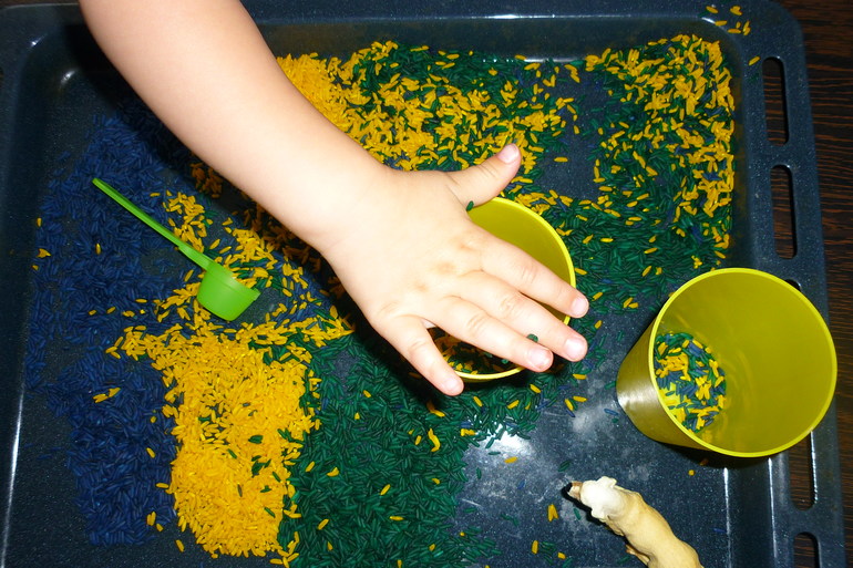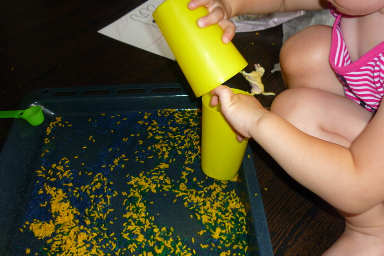Мы не только перебирали рис,но и пересыпали ложкой, стаканчиками, делали горку для собачки, а она оттуда сбегала; закапывали собачку.