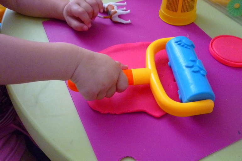 Сашенька так увлеклась игрой, что собственно про собачку то и забыла.А она тем временем стала играть с пластилином. (я раскатала тесто для лепки, и начала вырезать фигурку собачки), а Сашуля уже уселась рядышком, тут же забрала фигурку и давай выдавливать.