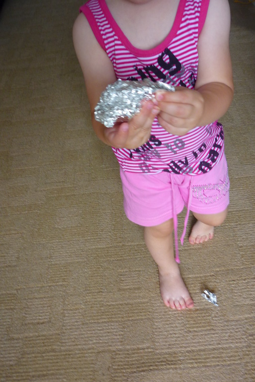 Малышку ждал еще один сюрприз: "Кто там?"- развернув фольгу и увидев в ней собачку, почему-то Сашуля расхохоталась и начала собирать сюрприз обратно
