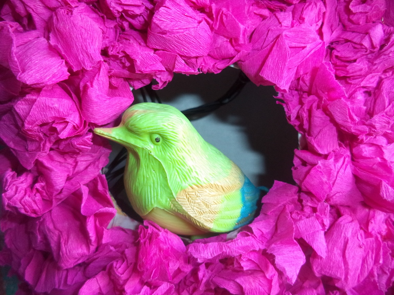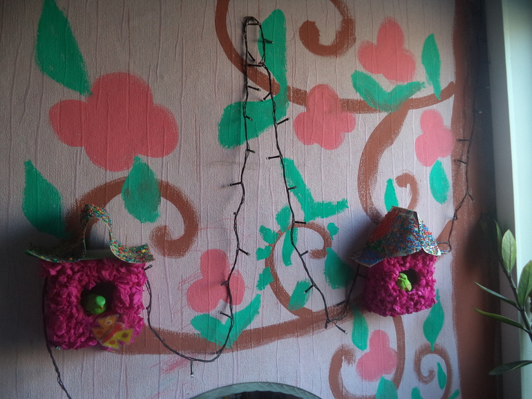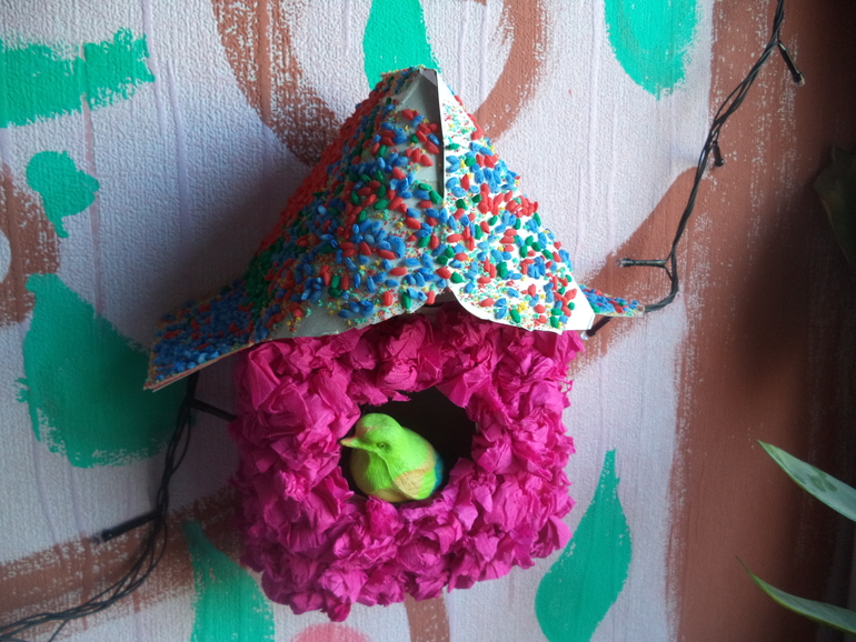 Начали мастерить: разрезали коробку от чоко-пая( маленькая, 6 печенек), вырезали круглые отверстия и обклеили креповой бумагой. Рвали ее на кусочки и катали шарики, приклеивали на клей ПВА. Крышу не знаю как, но сделали-не приклеивали к скворечнику- просто сверху поставили. Верх крыши украсили остатками крашенного риса и манки. Дочкину обмазывала клеем ПВА (плохо получилось-крыша прогнулась)), а свою двухсторонним скотчем.